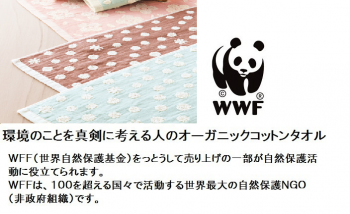 環境のことを真剣に考える人の「オーガニックコットンタオル」。 WWF(世界自然保護基金)を通して売り上げの一部が自然保護活動に役立てられます。